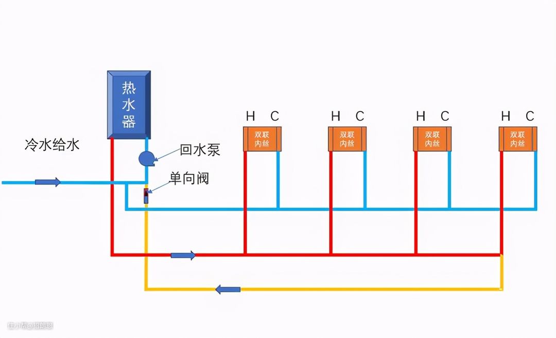 当然,还有一种循环方式区别于大循环、小循环,不需要增加回水管,只需要在最远端的冷水管和热水管之间增加一个单向阀,让冷水管充当回水管,重新回流到热水器里加热,如下图:
