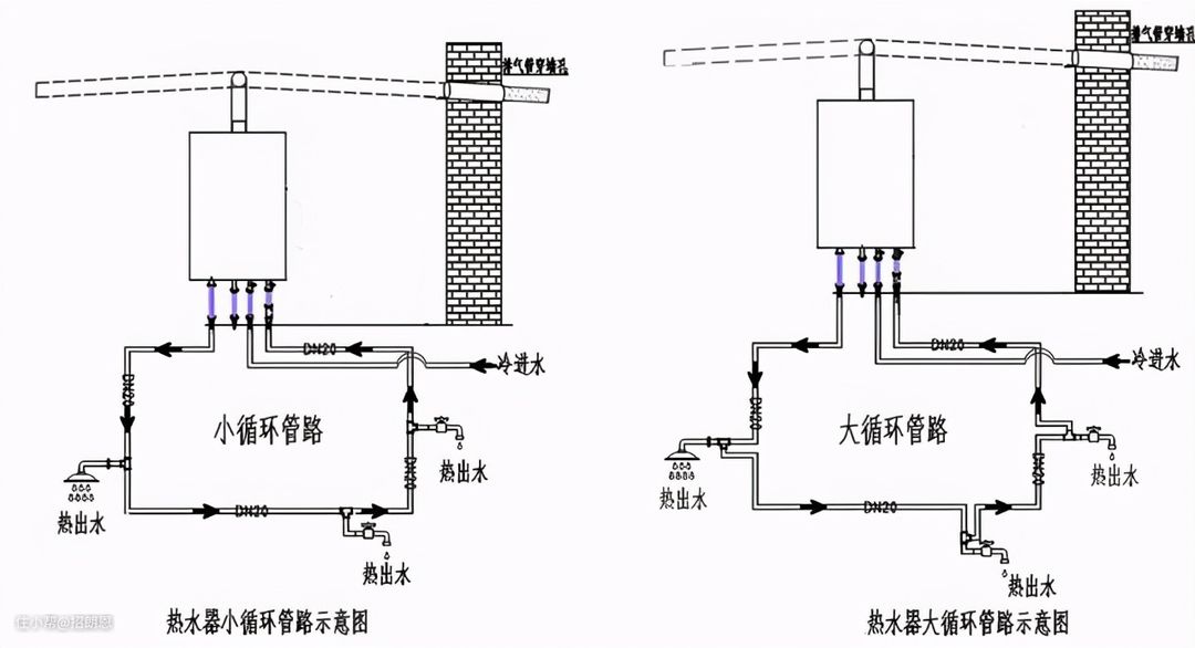 了解完循环水之后,我们再来了解“大循环”和“小循环”,也就是上面循环系统里提到的循环路径及方式,但前提是要解决好动力源的问题(循环泵、回水器),并且在装修时增加回水管。