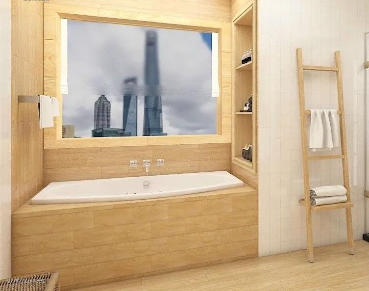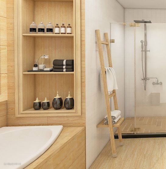 ▲利用浴缸上方空间打造壁龛,用来放置沐浴使用的毛巾浴巾、香薰、沐浴露等,拿取方便,又不占空间。