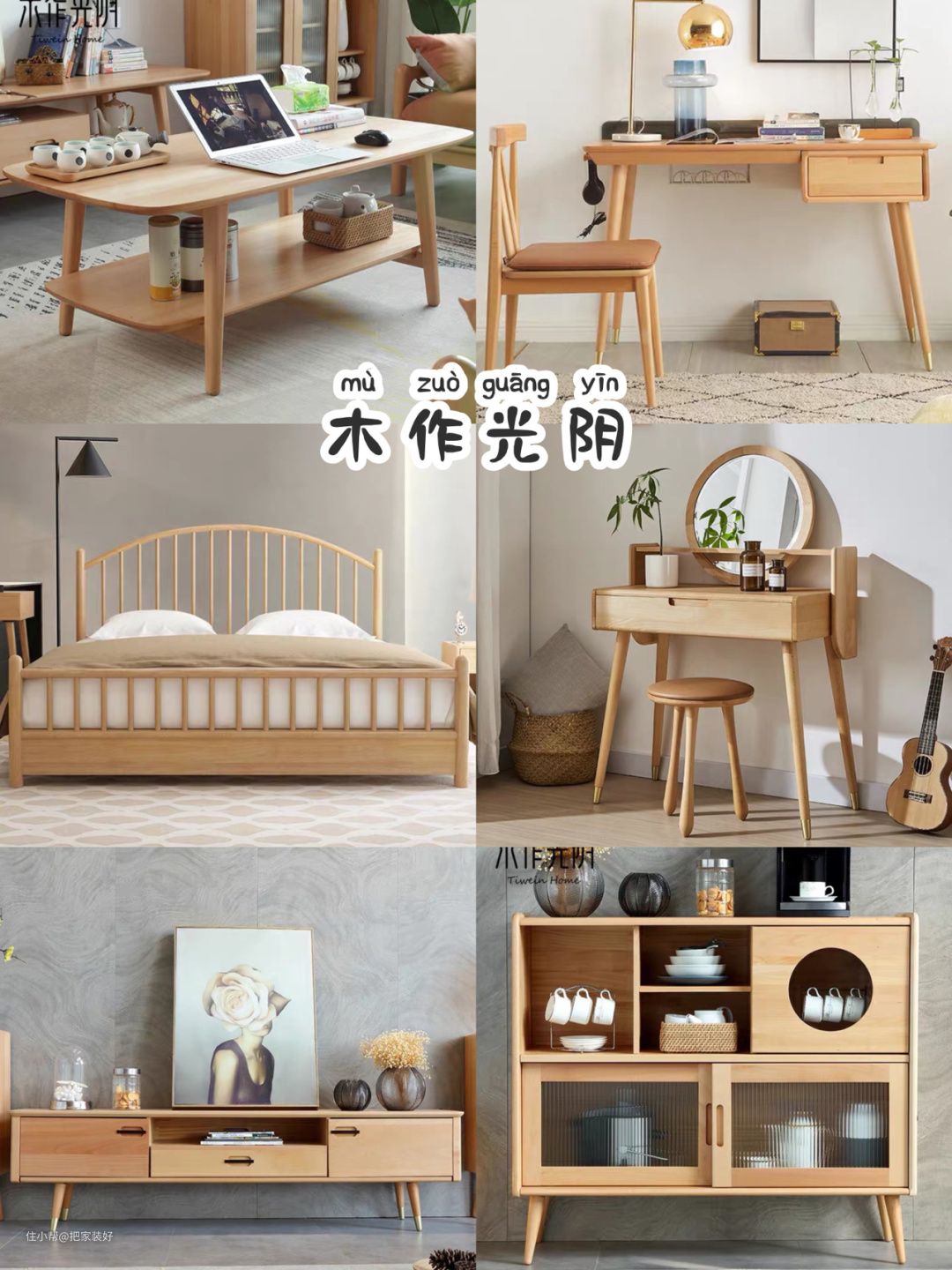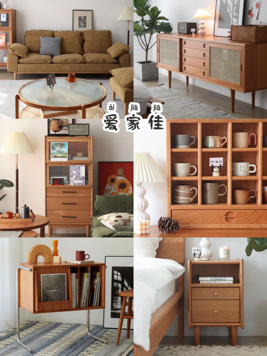 简约风的松木矮茶几,田园风的雕花储物柜,清新自然。