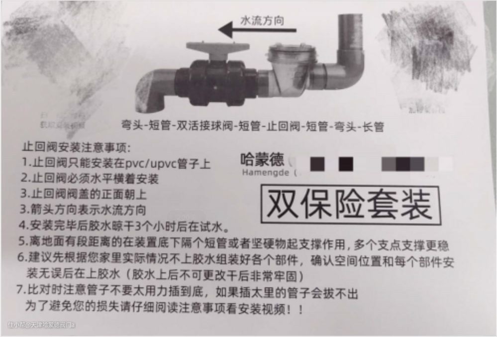 3.图上胶水承插安装:注意原来的管道要是有粉尘水泥要清洗干净胶水才能粘,有箭头一面朝上,箭头方向是水流的方向。管子接触的位置和配件的和管子接触的地方均匀的涂上胶水让胶水和管子配件完美拼接。哈蒙德止回阀要横着水平安装才能起到防反水效果。