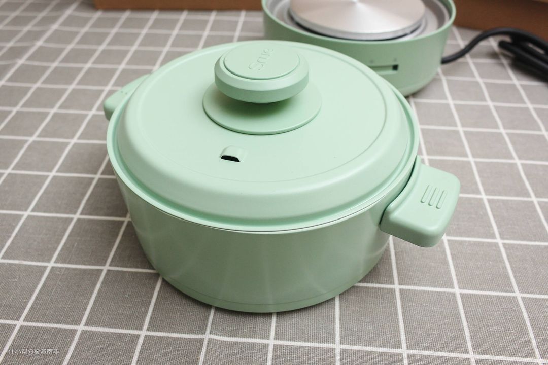 取出包装内的产品可以看到产品包含了电火锅主体,一个标配的1.5L容量的深锅还有一个配套的锅盖。我手上这款是浅茶绿配色,淡雅的颜色搭配简洁的设计让这个小锅看起来很可爱。