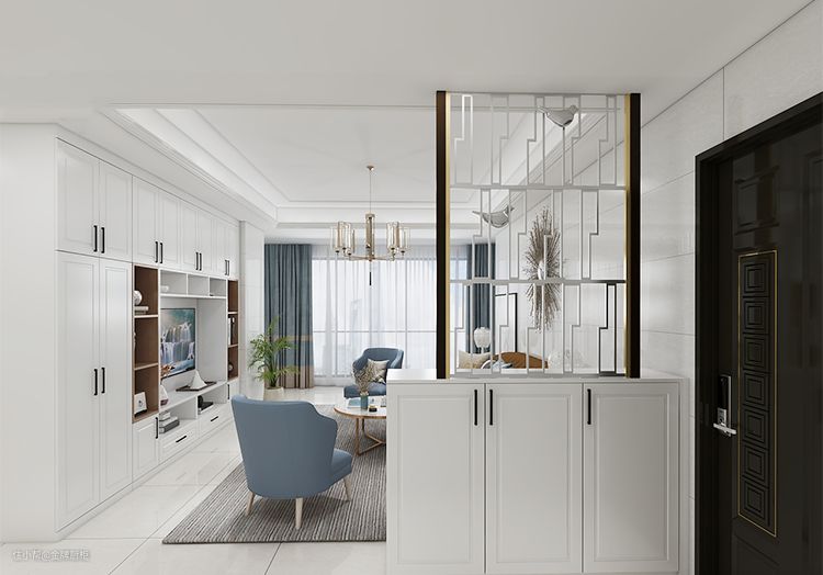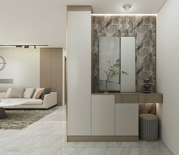 垂直于墙的位置,增加隔断墙或玄关柜的设计,创造出一个旋转型玄关,化解进门见厅的尴尬。