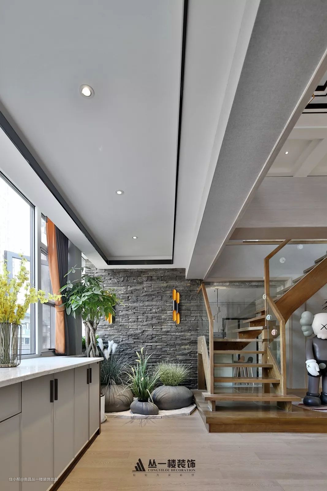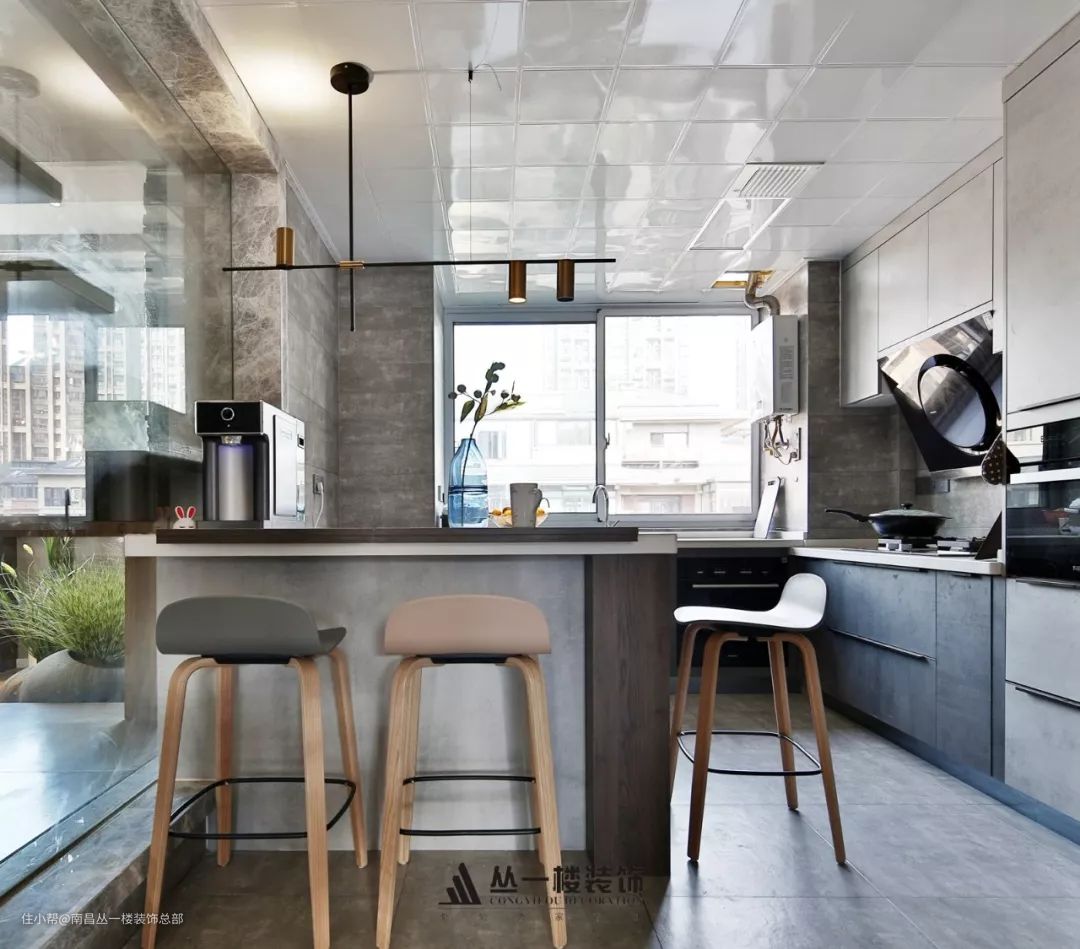 本案位于青山湖宜居的地段,洋房顶楼复式结构,起初的结构不是很理想,楼梯的架设也不是满意,而设计师的理念是用充足的阳光和良好的对流为家增添一丝丝的生气