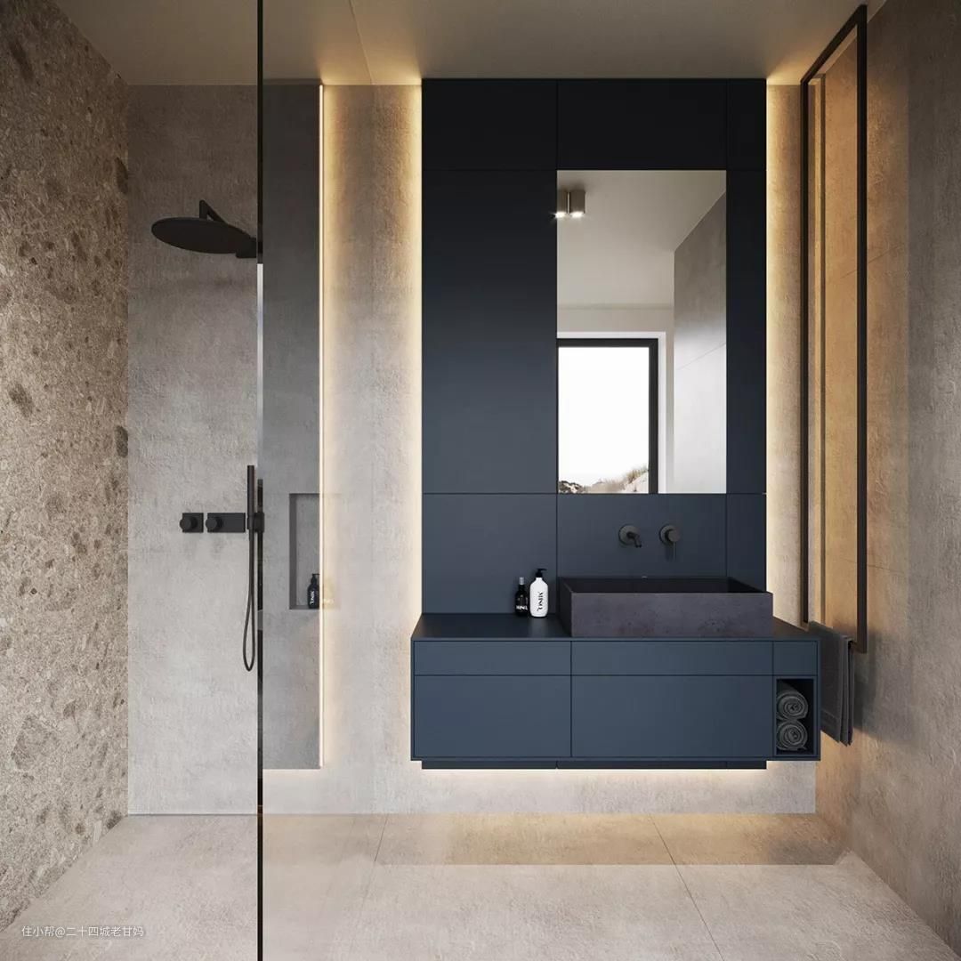 ▲这套卫生间主色调采用灰色+莫兰迪蓝,搭配黑色洗漱台,凸显高级质感。