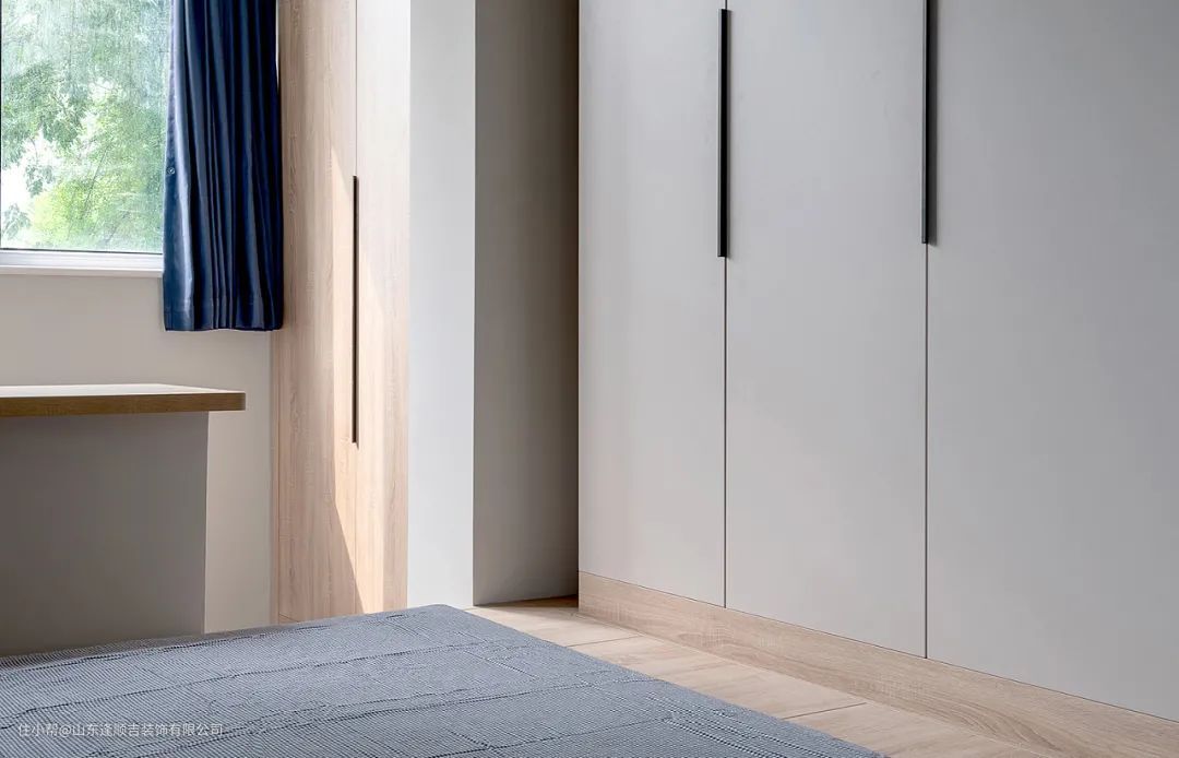 床头墙一侧安装了延伸到衣柜的木饰面板,能够保护墙面且便于打理,面板与窗台石之间需测量好高度,衔接起来更美观。