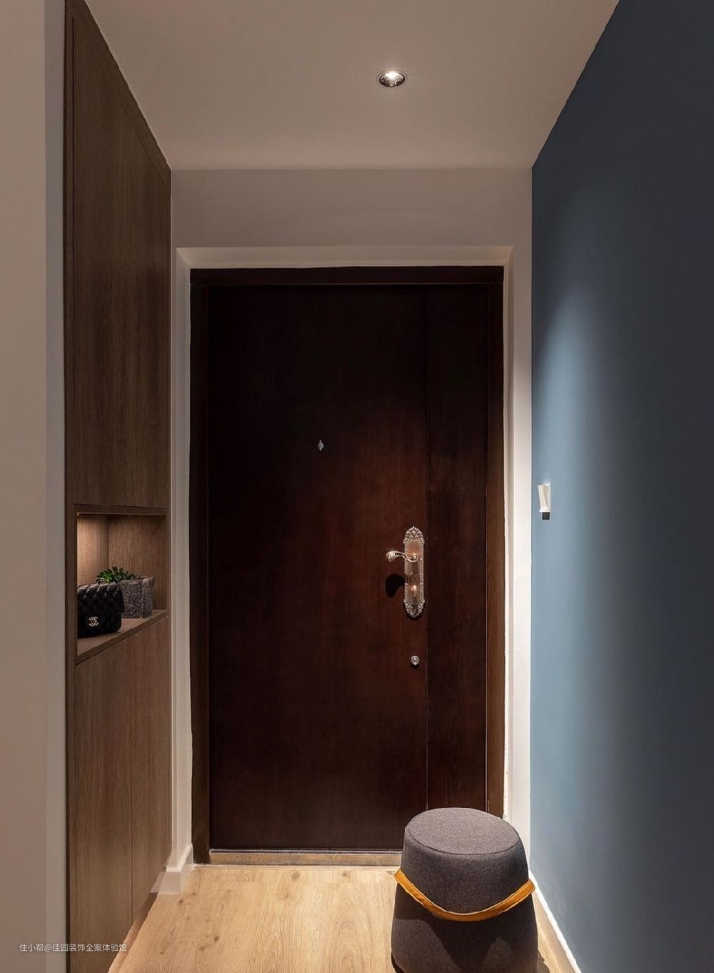 玄关由鞋柜、换鞋凳等元素组成。在进门右手位置设置换鞋柜,符合人体工程学之外,最大化的利用了空间。可移动的换鞋凳既美观又舒适。最简单的鞋柜形式加以上下灯带的融合
