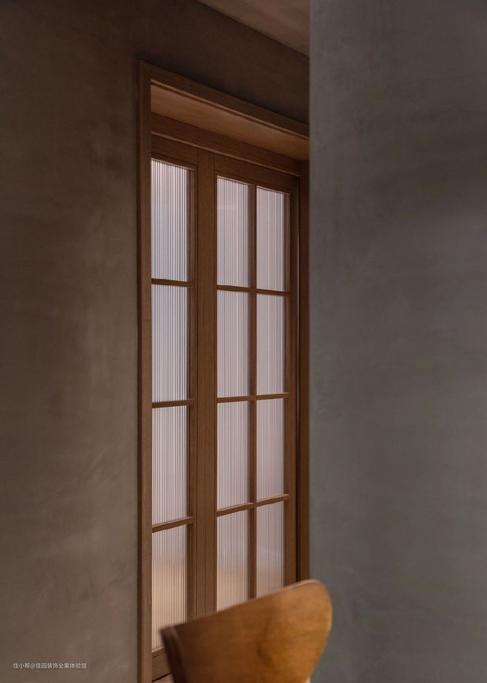 从餐厅朝书房位置看去,长虹玻璃加木质的双推拉门,空间的另一个角度的美跃然纸上
