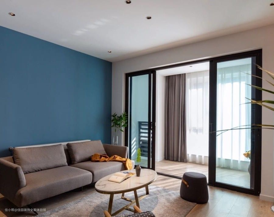在客厅的空间里,使用水泥漆做为电视背景墙,让客厅空间增加了不少质感。蓝色的沙发背景,让整个空间有了活力。