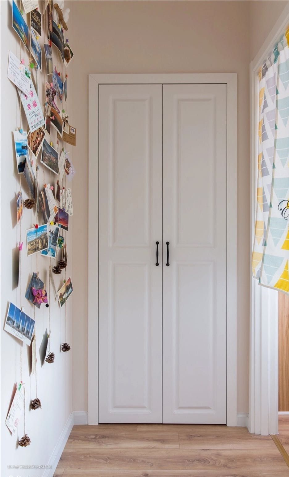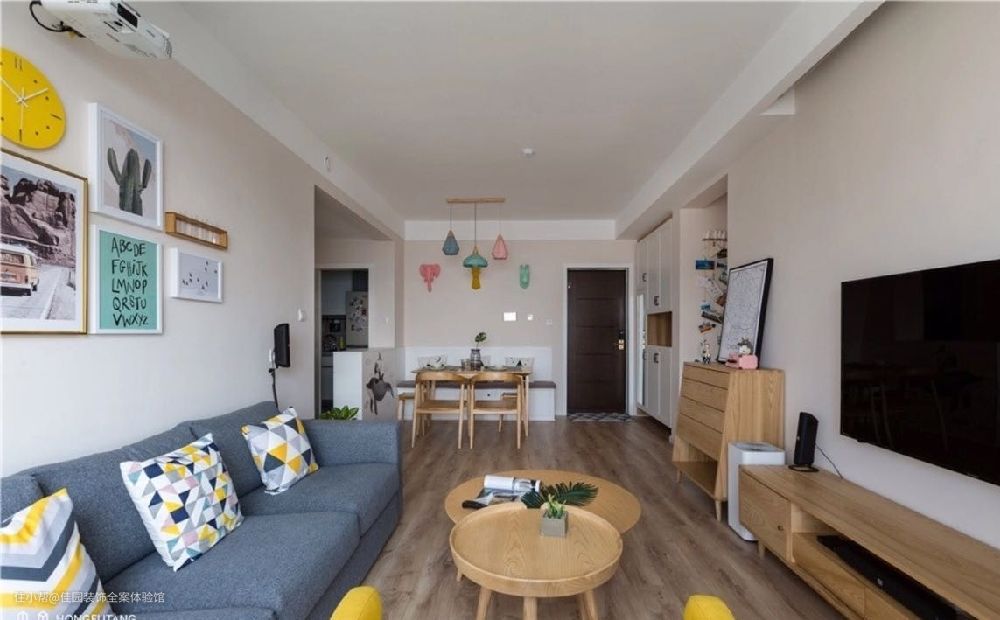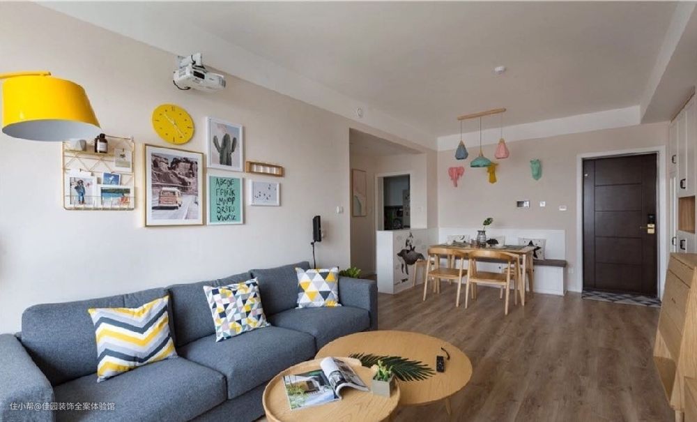 业主小两口喜欢旅游,喜欢暖色调,他们希望家里有一面明信片墙,挂去各地带回的明信片或是合影。家里不一定要高大上的配色,温馨舒适就好。