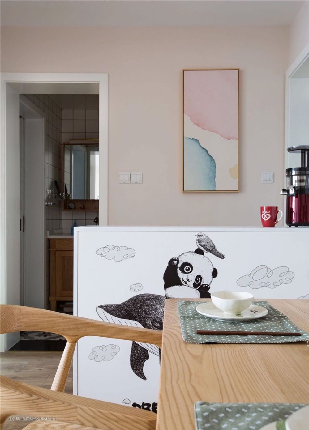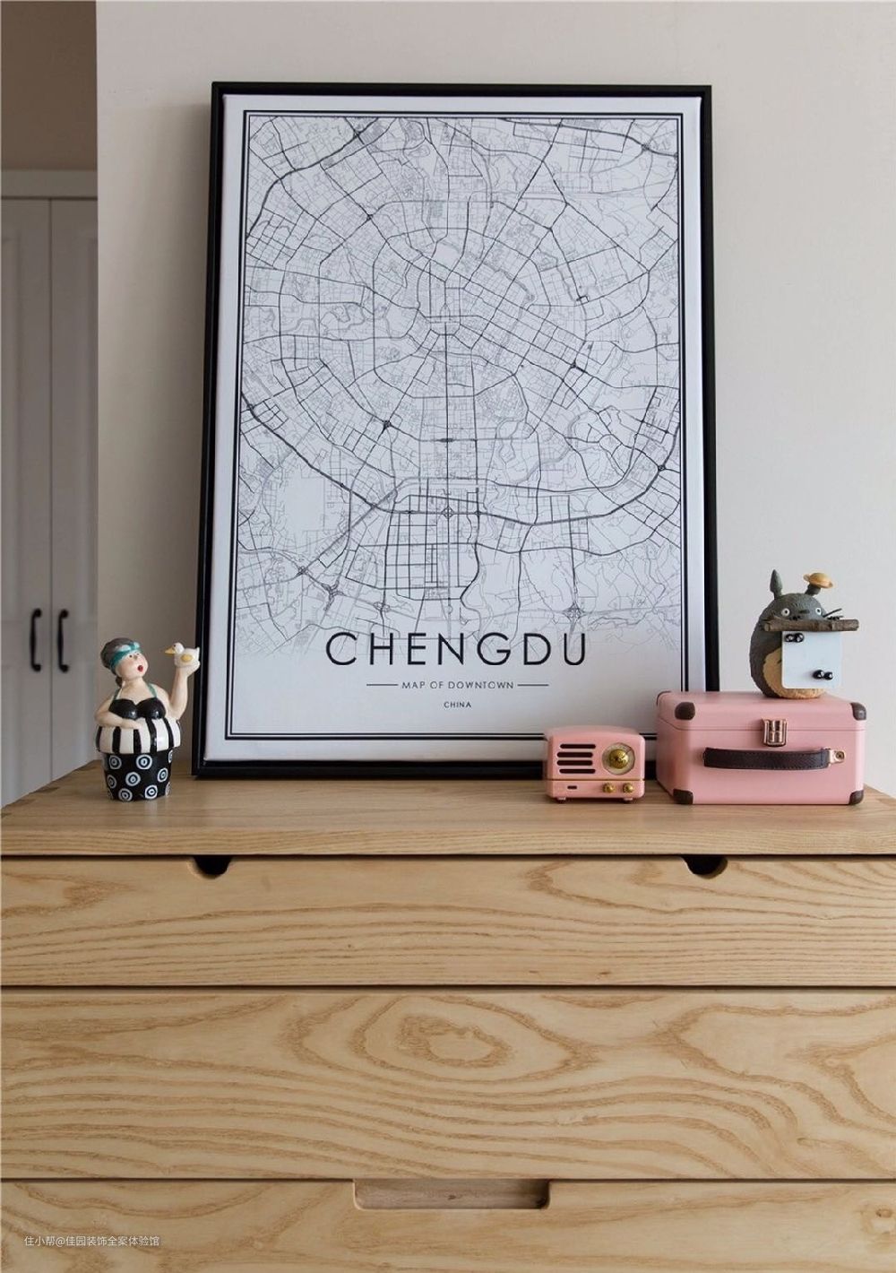 矮柜上带游泳圈的陶瓷摆件是业主去布拉格带回来的,粉红的小音箱,可爱的龙猫摆件。