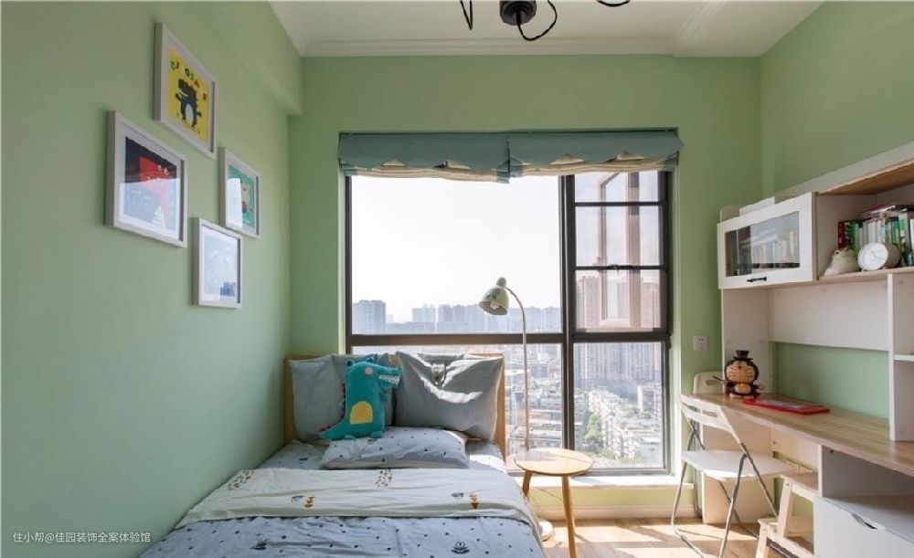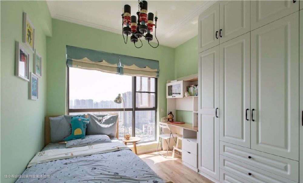 业主希望儿童房尽可能地显得大,收纳空间也要最大化,于是右侧是一整排定制衣柜加书桌,右边靠墙是一张1.2米实木儿童床