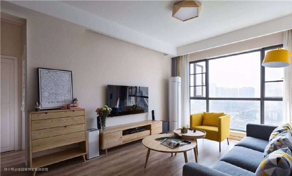 整个客厅多为原木色家具,深灰色三人沙发和柠檬黄单人沙发都来自宜家。业主喜欢落地灯,于是在软装中选择了柠檬黄的户型落地灯。原本电视墙设计的是白色文化装,但是业主觉得比较常见,希望更为简洁的电视墙,最后改成了无造型电视墙,在后期软装上添加了实木矮柜,装饰画和摆件。