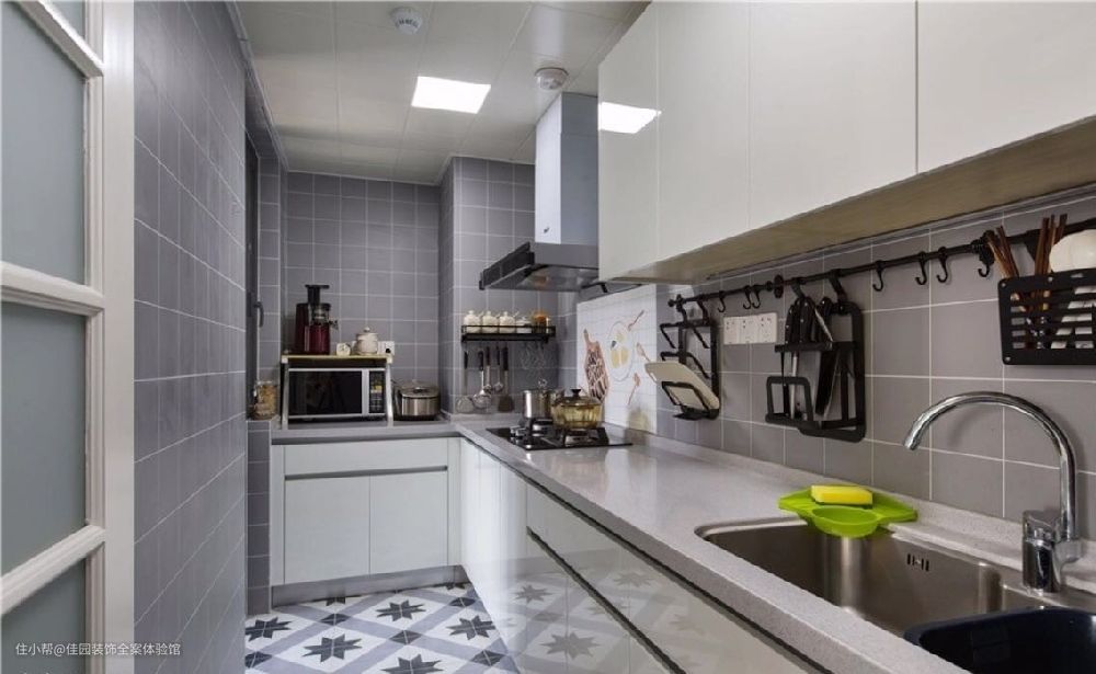 因为厨房采光不是很好,原本设计为白色小砖,但业主觉得不耐脏,又怕深色砖老气,后来改成浅灰色的小格砖搭配地面花砖。