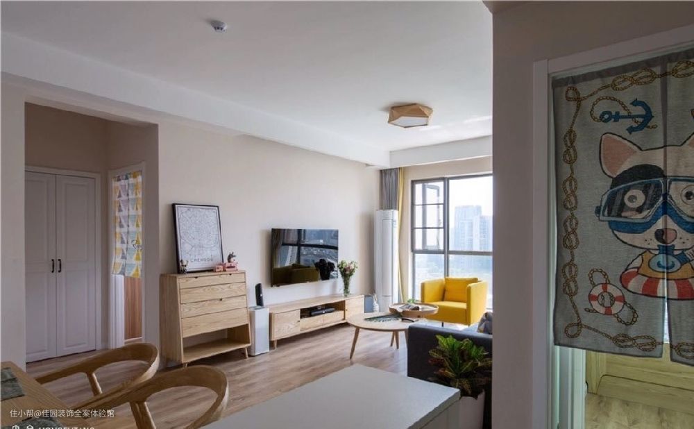 习惯睡觉不关门,风水门帘有隔断作用。主卧是几何图案风水帘,儿童房是卡通小狗图案的风水帘,在这个使用面积不足80平米的小家里,随随便便就能数出十个以上的小动物,轻快的色调,一进门就能闻到快乐的味道