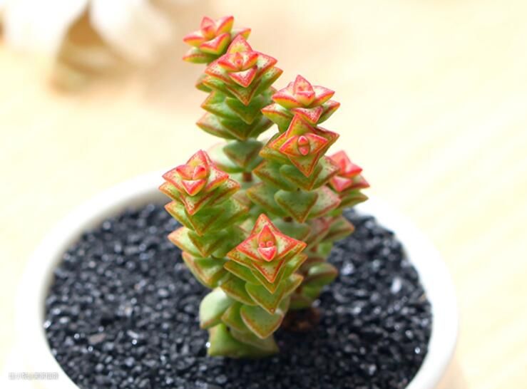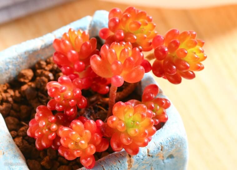 小小的叶子就如同红色的果实,点缀在肉质茎条上,看上去萌态十足,叶片在合适的环境条件下,会红润多汁。如果家里养的绿植比较多,看厌了葱绿的颜色,可以选择小小的红色浆果多肉,给你的小花园增添不一样的颜色。