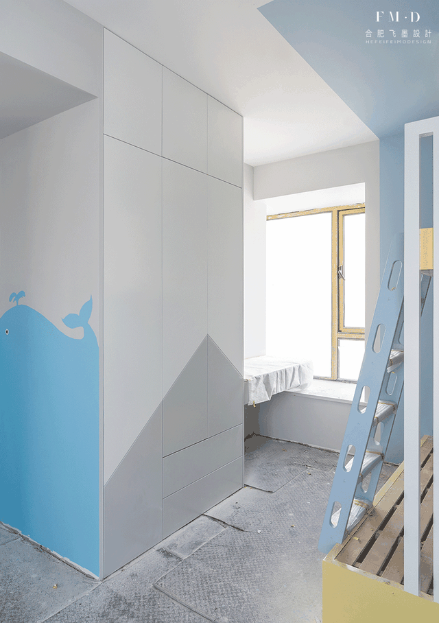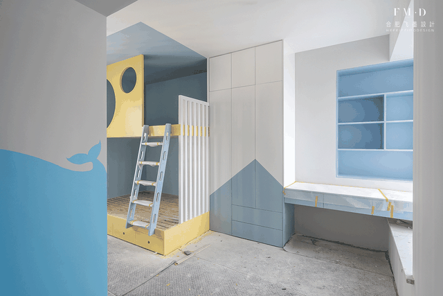 13㎡一间儿童房,打完了上下铺还塞下2排衣柜2张书桌!不同于其他的房间,儿童房应该欢快有活力的,所以加入了纯净的蓝、活力的暖黄色,打造出拼色柜门的衣柜和书桌,墙面手绘鲸鱼宝宝的图案,而上下铺则利用刷漆的手法打造出独立空间感,这样配色出来的儿童房,我想就连大人见了都要心动羡慕了。