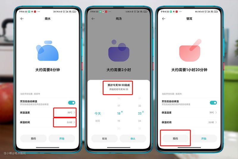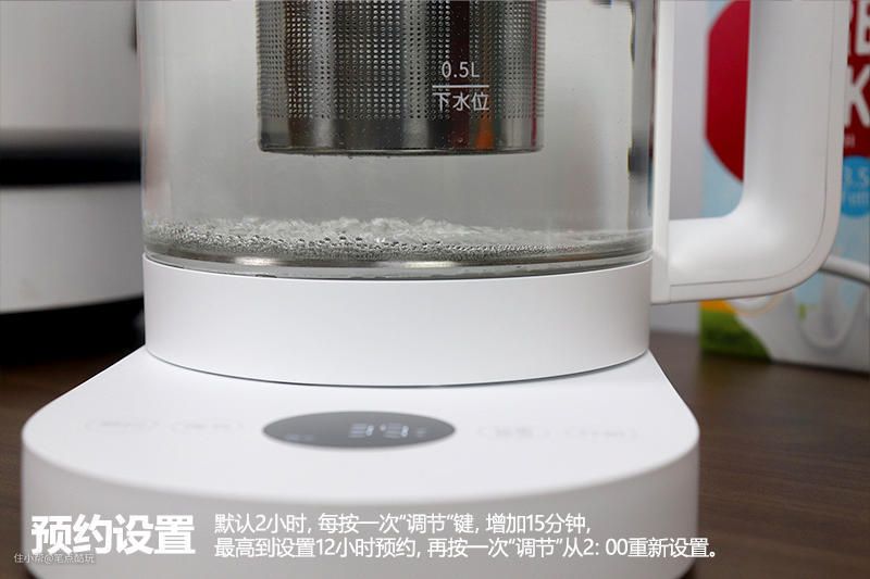 包括烧水在内的前五个模式,都可以按“预约”键,设置最少2小时、最多12小时的预约,按下预约后,再按调节键可以更改预约时长。