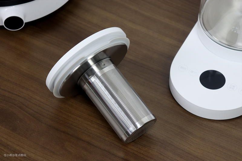 附赠不锈钢茶漏网眼细小密集,壶盖的背面也是不锈钢材质,且为一体化设计。