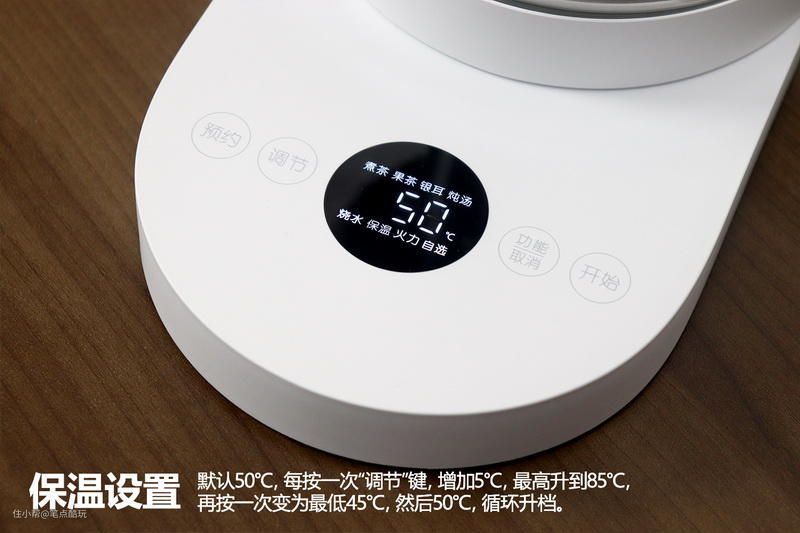 米家智能多功能养生壶与米家多功能电煮壶的另一个区别是操控方式。电煮壶是单独一个OLED屏旋钮,养生壶则用4个按键+1个直观的OLED显示屏实现8档位切换、调温、预约,屏显项目、实时水温、保温状态一目了然,2~12小时预约等操作也很顺手,相比之下,这款养生壶的操控方式学习成本更低。