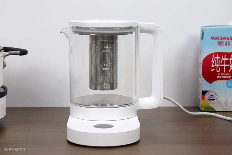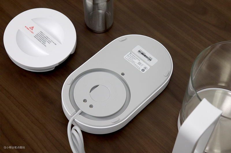 盖严盖子、壶体“落座”是下图这般模样。加厚优质高硼硅玻璃打造了结实的壶体,高低温耐受强;加热盘是304不锈钢的,更耐用。玻璃壶身透明度也很好,容量1.5升,三根水线其二标明液体最少、最多容量限度,玻璃壶口敞开。实测盛装1.5升壶水,煮沸之后也不会迸溅出来;另外倒水时水流顺畅,倾倒小水流时也不会沥沥啦啦的。防烫壶把受力感好,方便拿取,而且端握、倒水时不会烫手,整体安全性得到保证。唯一觉得要注意的是,壶盖对准位置才能盖好,角度转一点就无法正确盖严。