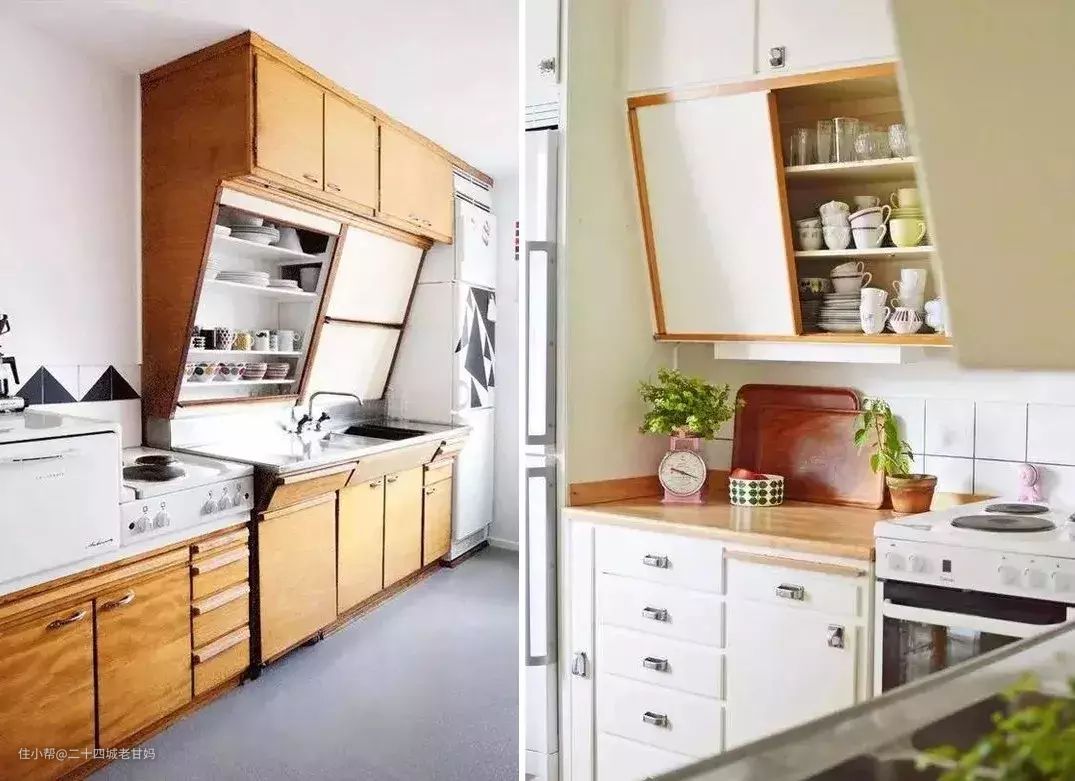 吊柜的不方便之处在于太高,拿取不方便,可以分层设计,上下两层柜门,或是开放式隔板+吊柜组合。