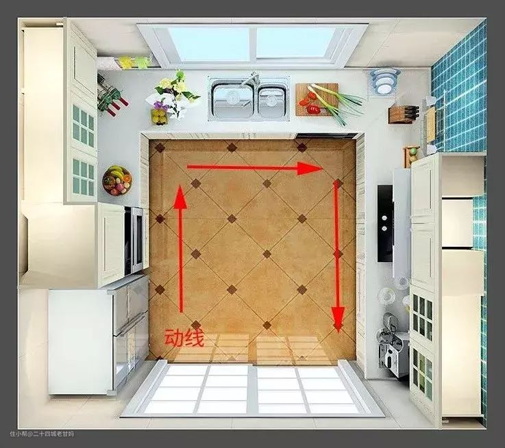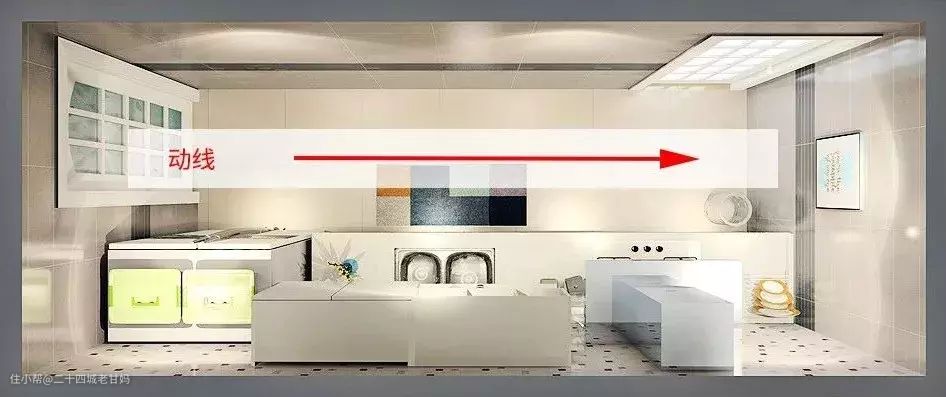 双线型:适合一面是厨房门一面是阳台门的厨房,中间是个通道,这个对厨房的宽度有要求,围合式的布局可以缩短来回走动的距离,转身就能洗切炒菜。