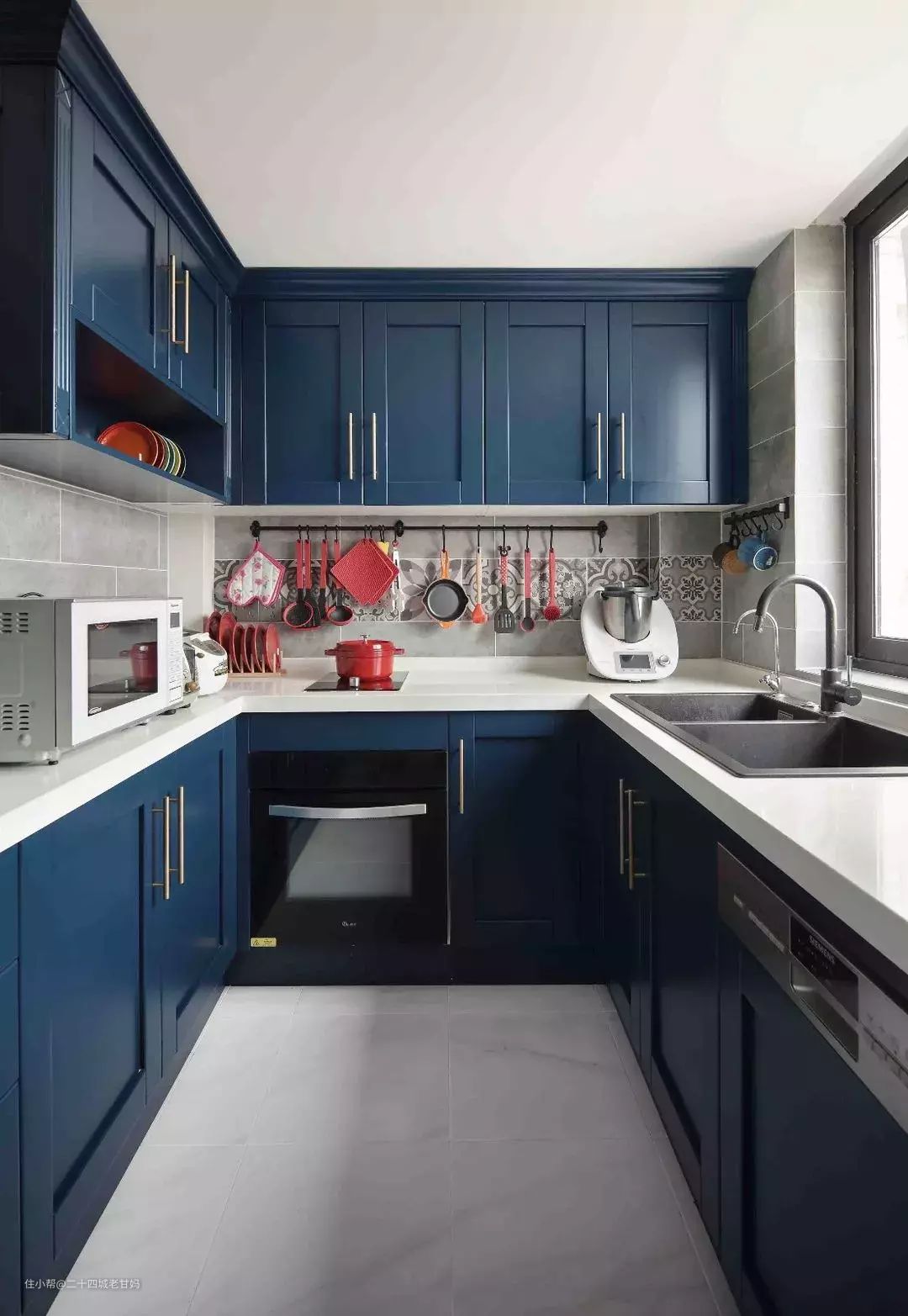 U型:大厨房推荐用这种布局,储物空间多,操作台面脚宽,有足够的弯腰和转身空间,能容纳多人操作。但和L型相比,多了一个转角,很容易形成鸡肋空间,要合理设计。