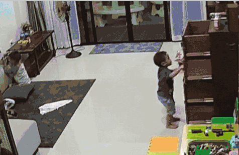 天下的孩子是一样的,都遵循万物皆可爬原则,爬柜子、储物架等等。