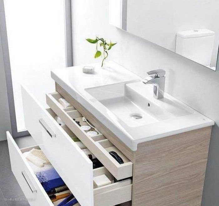 当然也不能忽视浴柜旁边的空余,如果家里空间较大,完全可以再加一个侧柜形式,储物更多。各种样式的柜体,上网看看能找很多灵感。