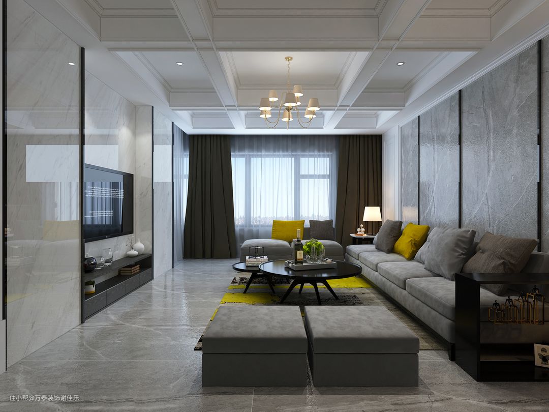 客厅在灰色的主基调上,用白色的通体瓷砖与灰色肌理石材材质进行调和与碰撞。时尚现代的灰色皮质沙发搭配上一抹黄色,放在整个空间中,却又让人觉得很和谐。