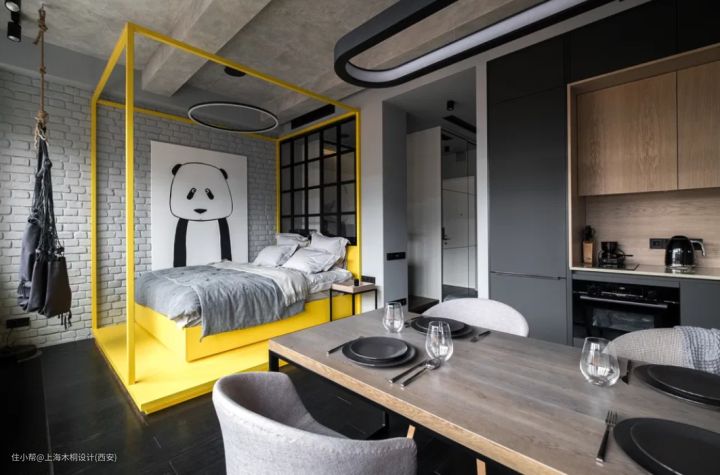 灰调的室内空间,睡眠区由黄色点缀,在整个空间中尤为瞩目。摒弃传统床头背景墙,采用格子玻璃墙,保证了室内采光和房间的通透感。