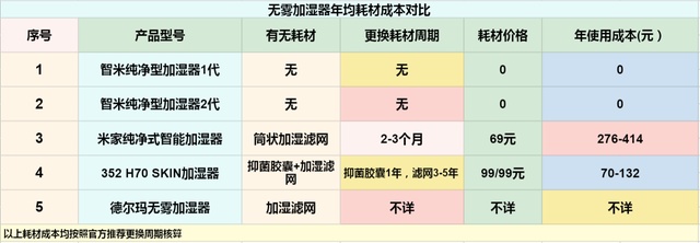 ▲从表中可以看出,除去两款智米纯净型加湿器后期无需耗材成本,其他三款产品都或多或少的需要固定支出耗材成本: