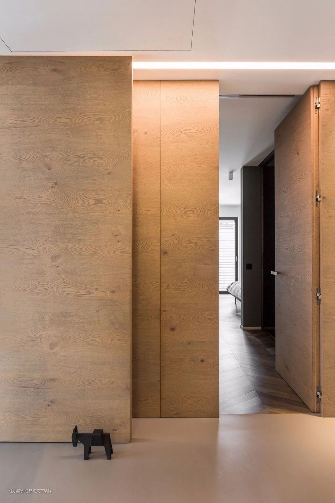 透过打开的厚实木门,能看到卧室的一些装修,地面由木地板铺就而成,光线透过玻璃窗洒进卧室。