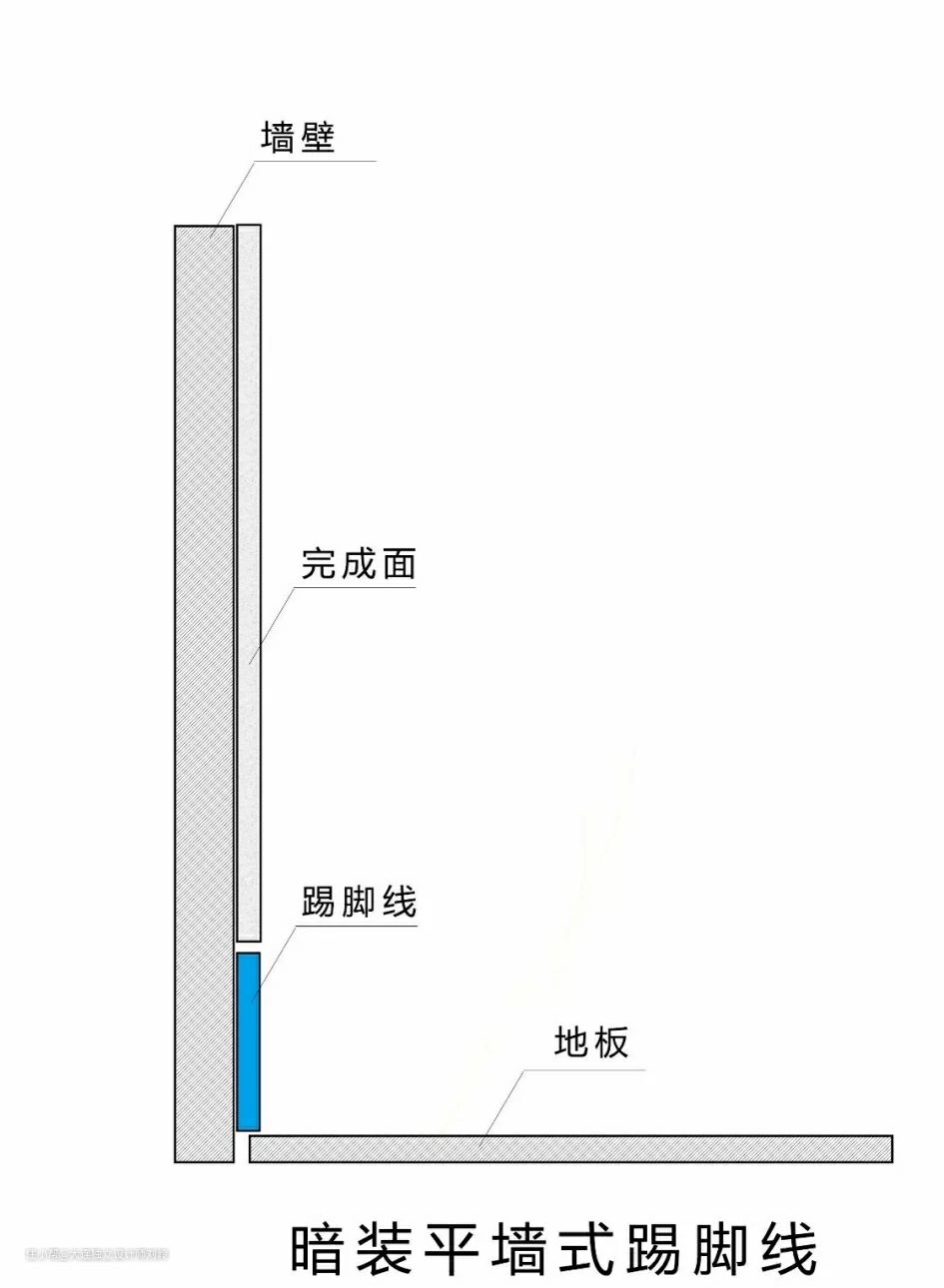 顾名思义墙体和踢脚线平行,墙面开槽把踢脚线嵌入墙体平齐,先地面再踢脚线,最后墙面。注意:提前估算好墙面厚度。美观度较高。