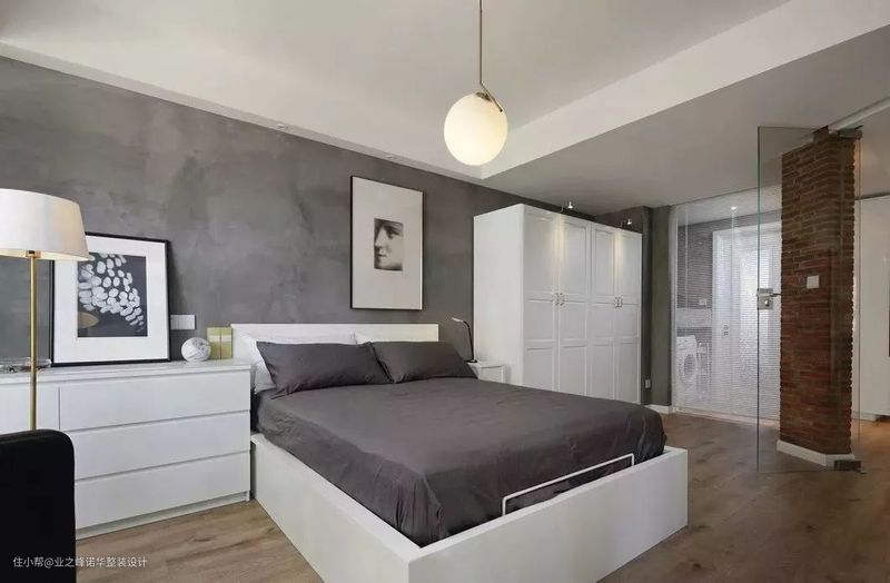 二层的卧室深色系的床品与整体色彩基调相和谐,营造了舒适的安睡环境。白色与灰色的混搭,让空间褪去沉闷。时尚的配饰、个性的挂画等细节之处体现了主人极高的艺术品位。