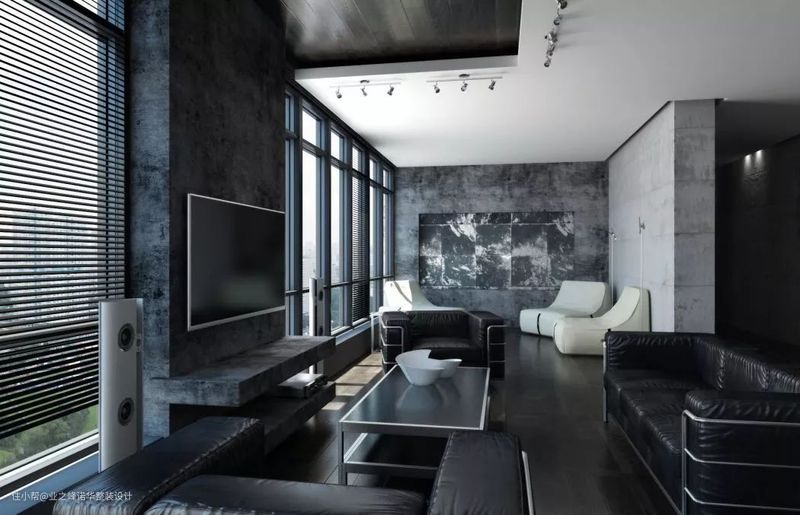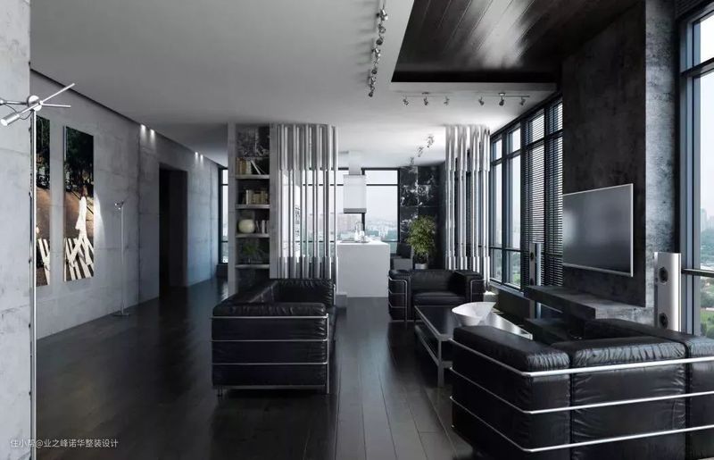黑色皮质沙发、水泥灰墙壁以及大理石的隔断墙等设计都彰显了空间的质感和腔调,对它的印象,便像是一位完美的成功人士,对生活品质有着极高的追求。四个人过斑马线的挂画显得与众不同,个性独特,让空间多了些生活气息。