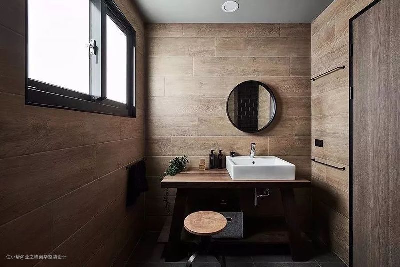 黑色砖的隔断墙将空间分为盥洗室和洗浴室,盥洗室用原木中和水泥灰,粗犷中又多了几分温和细腻。洗浴室大面积采用水泥墙壁,水泥墙的纯粹质朴,有着清爽干净大气的视觉享受。