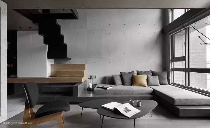 一层主要以水泥灰和黑色配饰相搭,安宁静谧,窝在靠窗的沙发里,享受着阳光的沐浴,捧一本书,品一杯茶,连时光都悄悄地慢下了脚步。身后的铁艺和原木的楼梯使空间多了层次感。