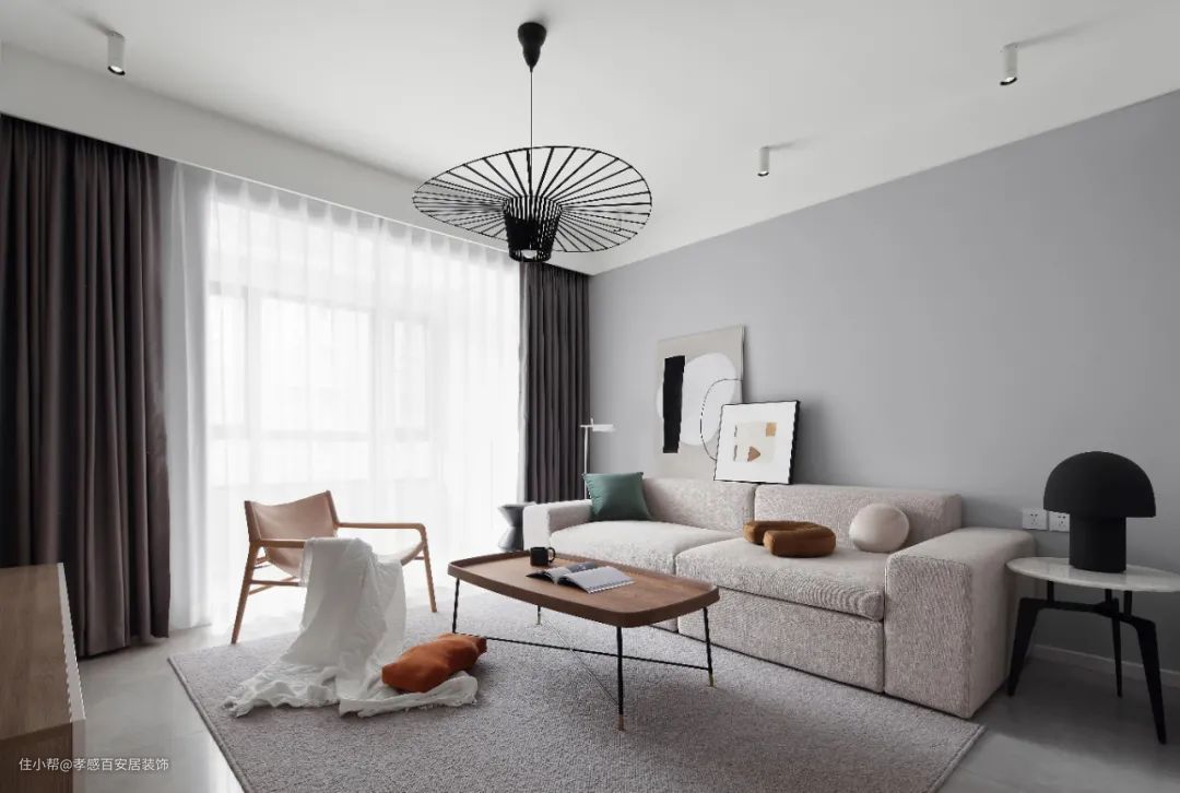 ▲客厅布置得简约清爽,没有多余的装饰,浅灰色沙发墙搭配布艺沙发,营造出舒适的宜居氛围。电视墙采用地板上墙,并将卧室门隐藏在里面,保证了整体性。