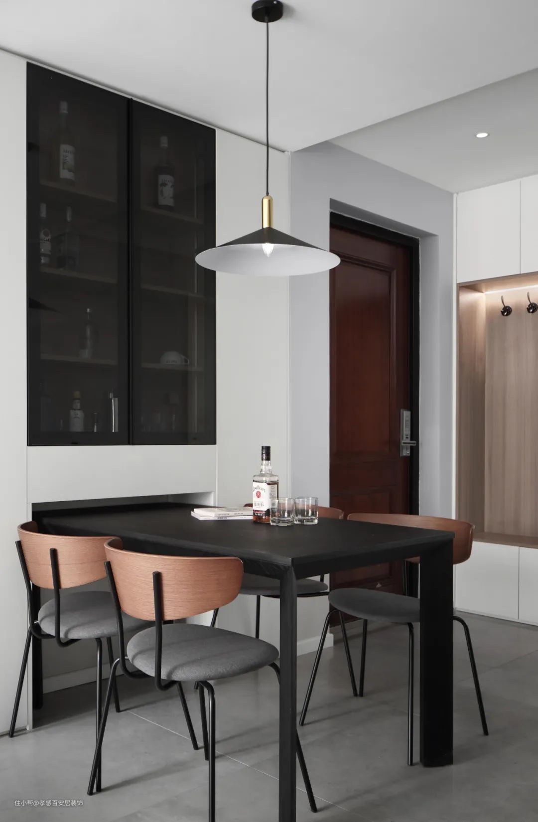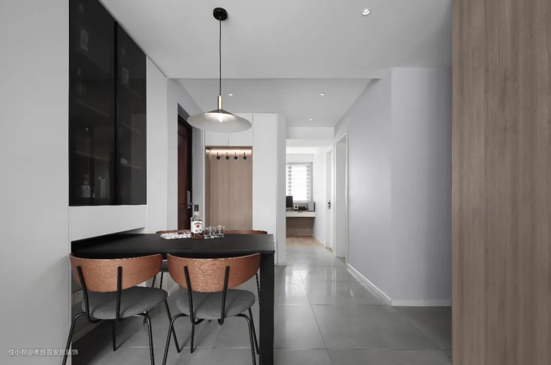 ▲进门右手边就是餐厅,打造入墙式的酒柜,满足业主对酒文化的爱好。餐桌椅选择轻盈造型,并将部分推进墙内凹槽,来客人时来出来不占用空间。