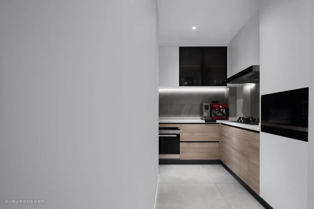 ▲半开放式的厨房设计,采用L型的橱柜布局,并将电器嵌入进柜体了,充分利用每一处空间。