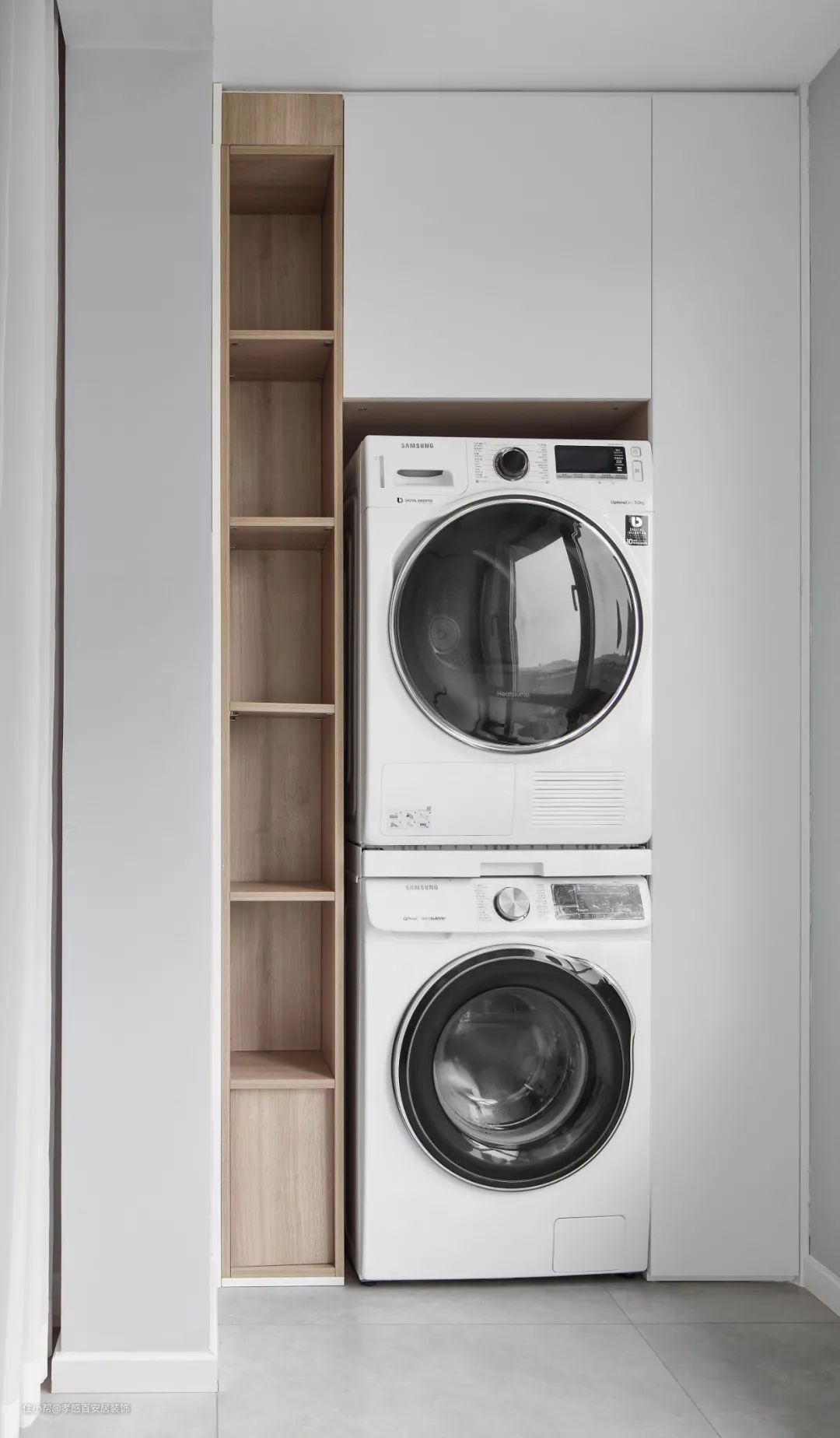 ▲阳台一侧定制的收纳柜,将洗衣机和烘干机嵌入进去,旁边的开放格放置洗衣用品或绿植,美观大方。