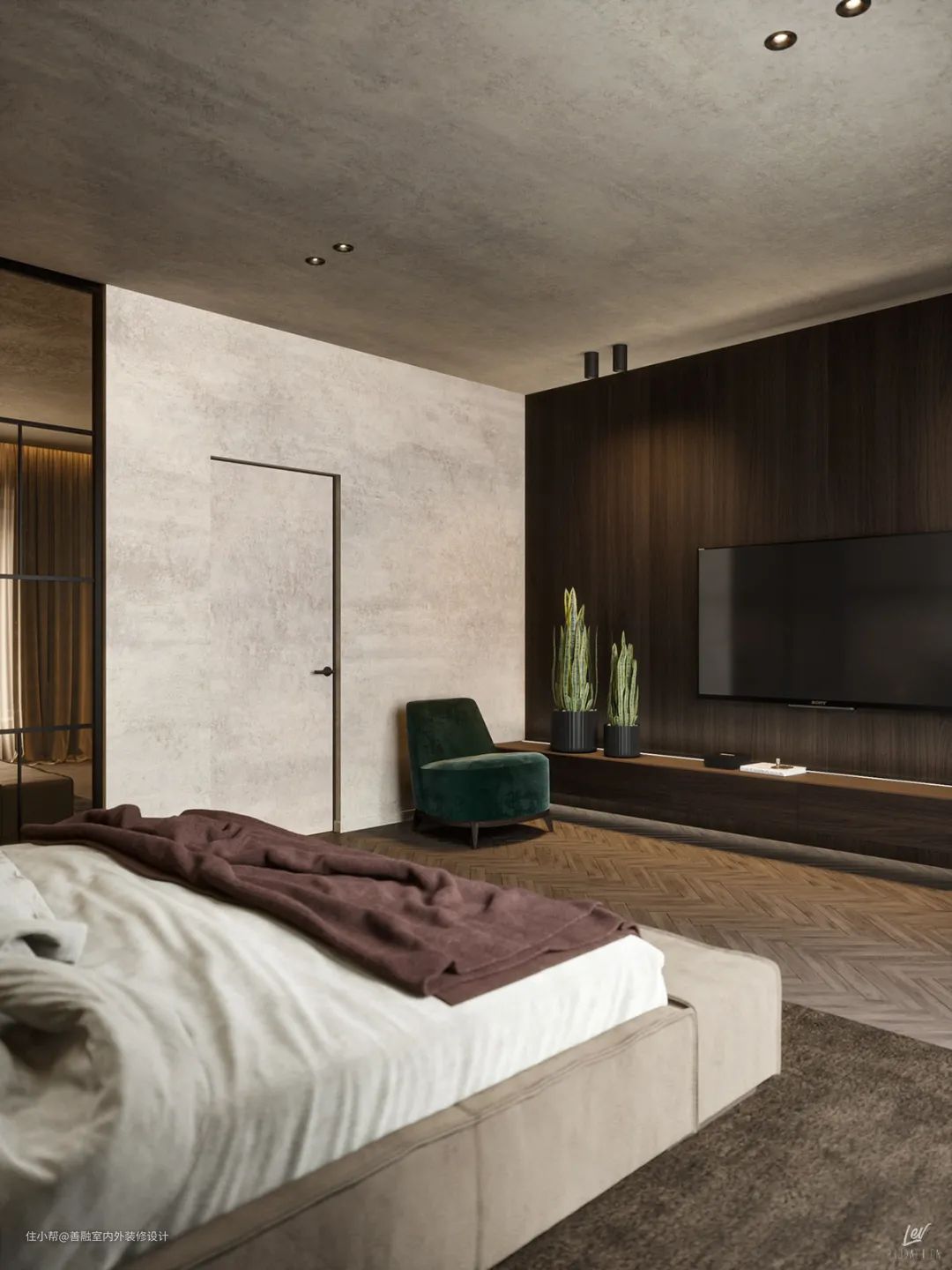 主卧室的设计选择了黑色灰色和木色的经典组合,加入工业元素,凭借设计师的经验,基于简单性的架构,创建简单的形式,使灯光和材质在空间中发挥最大的作用,反映真实性和真诚的简单性,无需点缀即可表达自己。