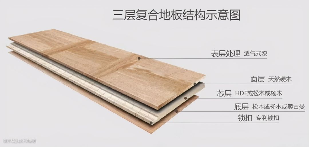 ①三层实木复合地板:以实木拼板或单板为面板,以实木拼板为芯层,以单板为底层的三层结构实木复合地板。