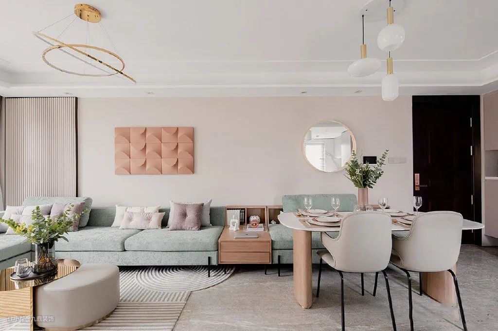 客餐厅家具的风格是统一的,莫兰迪配色+轻奢风设计,有颜值、有格调、有质感。