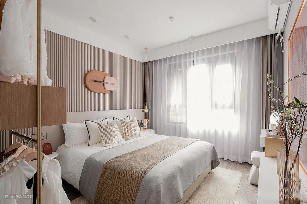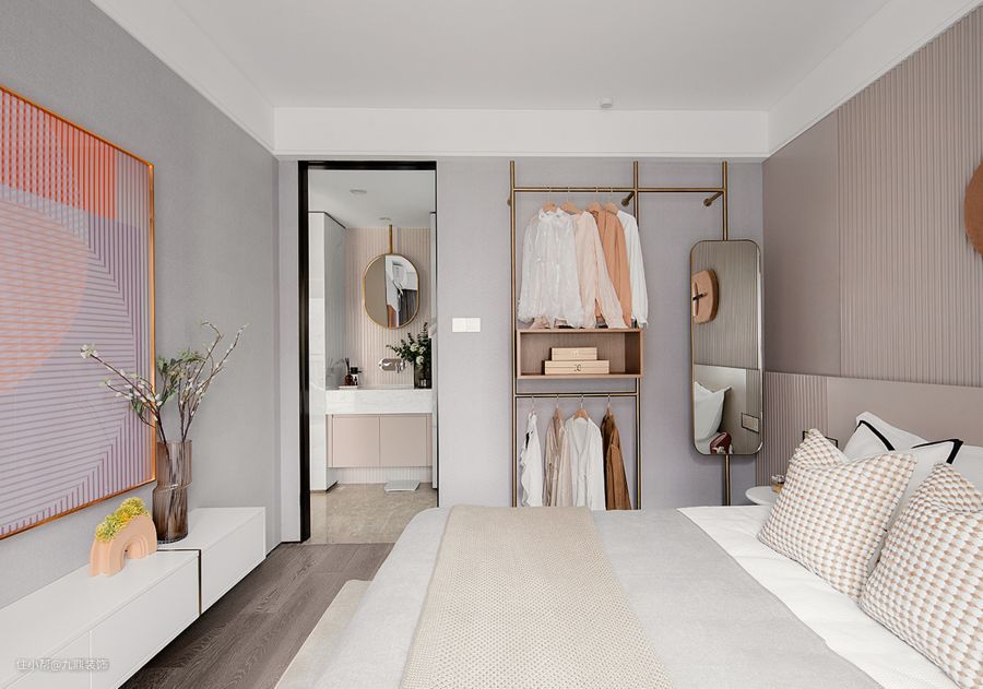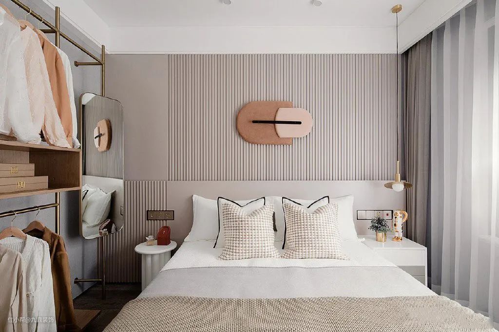 卧室的颜值也很高,衣柜的设计比较不实用。因为这套案例是做样板间的,装修效果以好看、时尚为主。