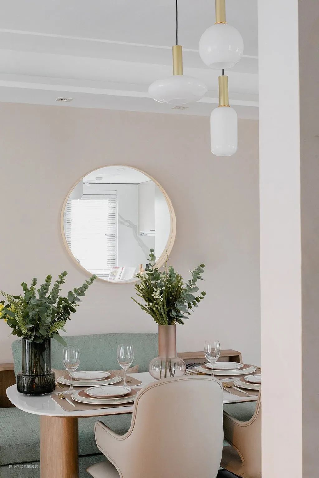 墙面、家具和软装都以莫兰迪系配色为主,搭配带有轻奢质感的大理石餐桌、黄铜灯饰,高雅精致