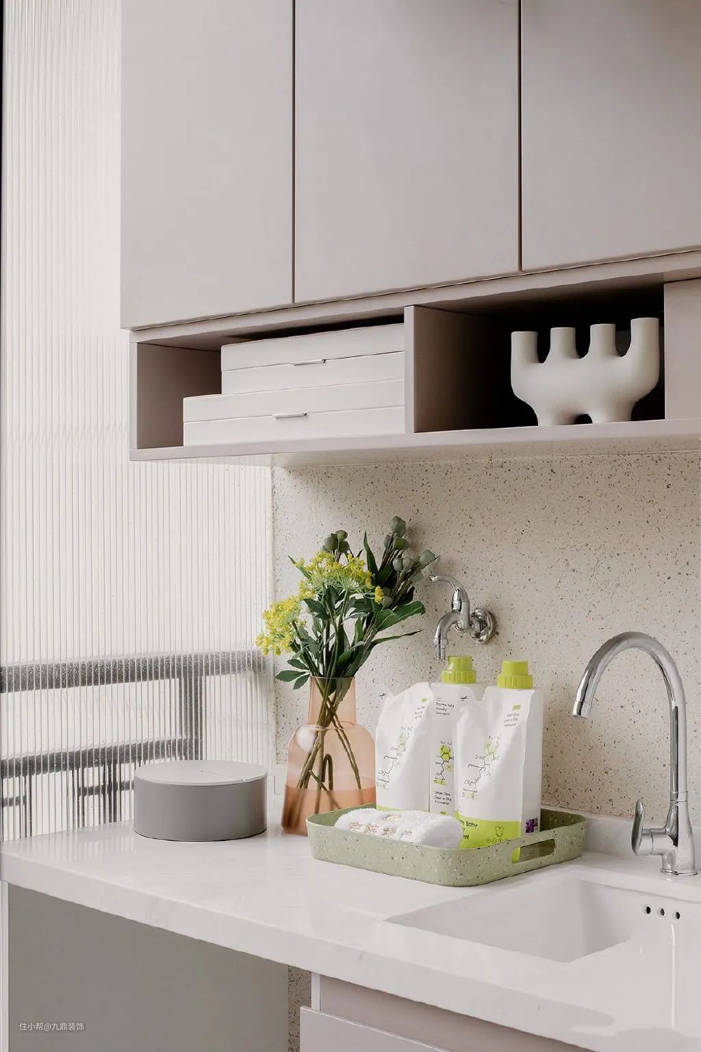 阳台的隐形防护网不仅能起防护的作用,还兼顾美观功能。洗衣区墙面铺贴着水磨石瓷砖,浅浅的色调,与整个空间的配色极为和谐。