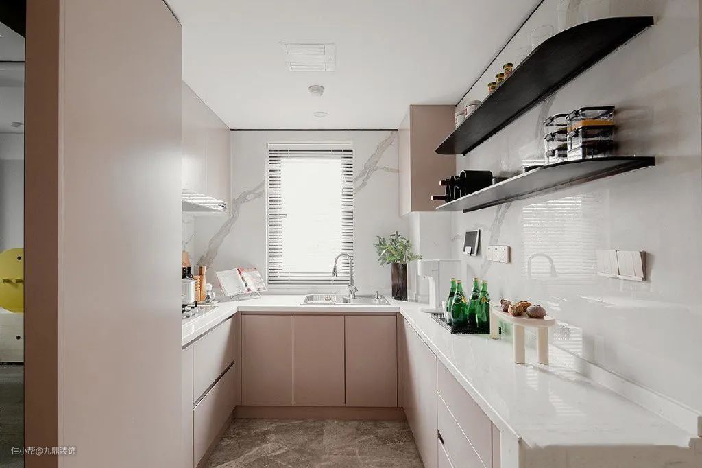 厨房是U型的,橱柜与墙面的配色高雅柔和,将厨房区域衬托得明亮而洁净。厨房侧面还嵌入了一个酒柜,增加了实用性与品质感。